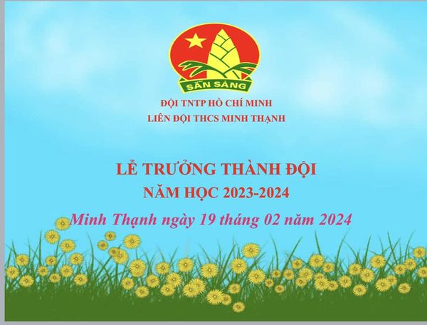 LỄ TRƯỞNG THÀNH ĐỘI VÀ TRAO GIẤY CHỨNG NHẬN HOÀN THÀNH CHƯƠNG TRÌNH RLĐV HẠNG TRƯỞNG THÀNH. Thực hiện chương trình công tác Đội, kế hoạch năm học 2023-2024, hướng tới kỷ niệm 93 năm ngày thành lập Đoàn TNCS Hồ Chí Minh (26/3/1931-26/3/2024) Sáng nay (19/2/2024) Liên Đội THCS Minh Thạnh trang trọng tổ chức lễ trưởng thành Đội cho 124 Đội viên khối lớp 9. Trải qua nhiều năm rèn luyện, phấn đấu trong tổ chức Đội TNTP Hồ Chí Minh, các em Đội viên lớp 9 của trường THCS Minh Thạnh đã đủđiều kiện để trưởng thành. Được chính thức công nhận là Đội viên trưởng thành, điều đó thật có ý nghĩa lớn lao. Chiếc khăn quàng đỏ thân thương từ nay không còn là người bạn đồng hành của các em HS lớp 9 vì các em sắp bước vào sinh hoạt trong một tổ chức mới phù hợp với lứa tuổi và nguyện vọng của mình. Các em trao lại chiếc khăn quàng đỏ thân thương - niềm tự hào của người Đội viên cho lớp đàn em kế tiếp sự nghiệp vinh quang của Đội TNTP Hồ Chí Minh. Các em HS khối lớp 9 kể từ thời điểm này đã rời xa chiếc khăn quàng đỏđã gắn bó với các em trong nhiều năm qua để bước vào một giai đoạn phát triển mới. Mong rằng các em hãy cố gắng phấn đấu để xứng đáng với công lao to lớn của thầy cô dành cho các em.